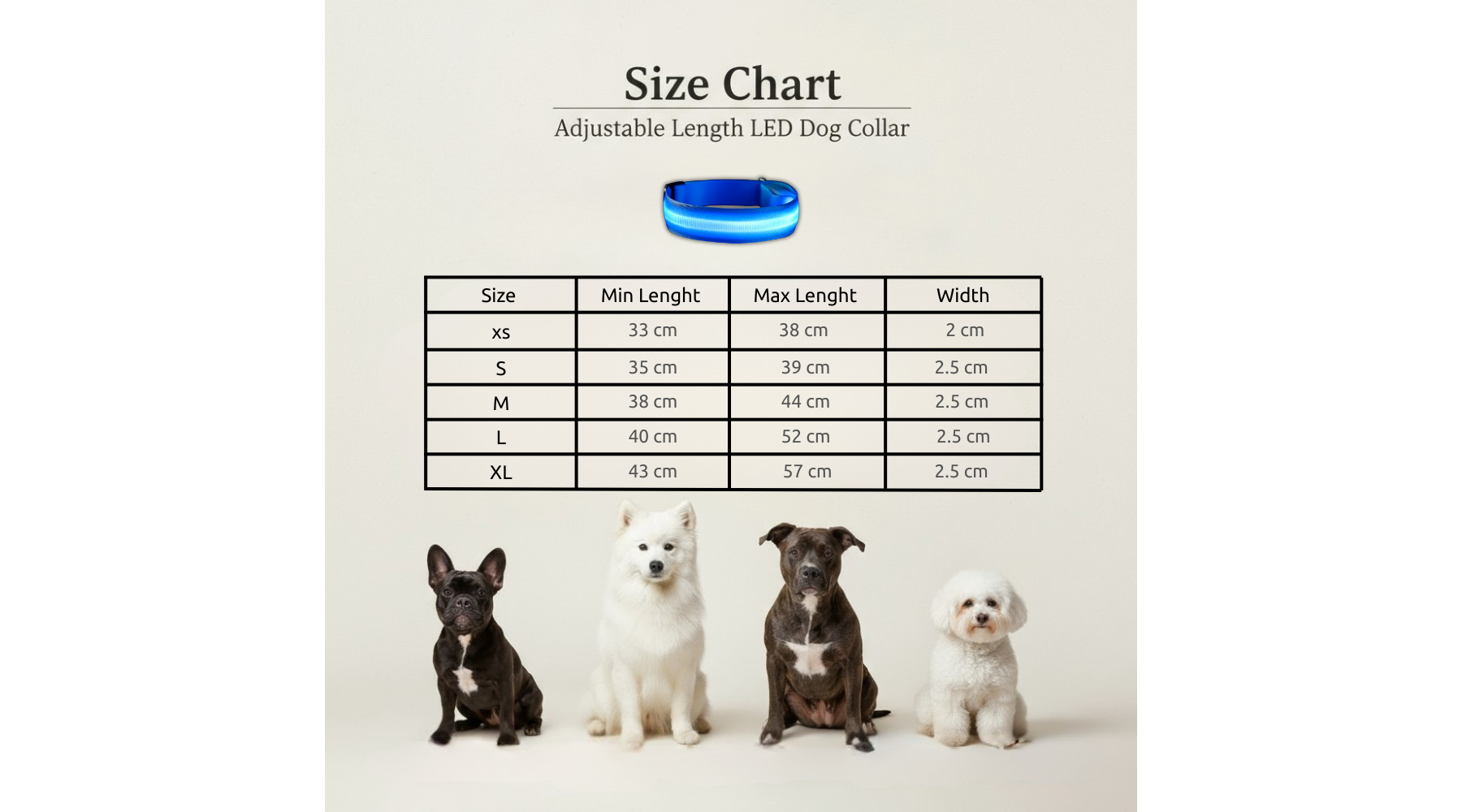 Every dog deserves a collar that feels just right. Our LED collars are fully adjustable to ensure comfort and safety for dogs of all sizes. Use the chart bellow to find your dog’s ideal fit before ordering.